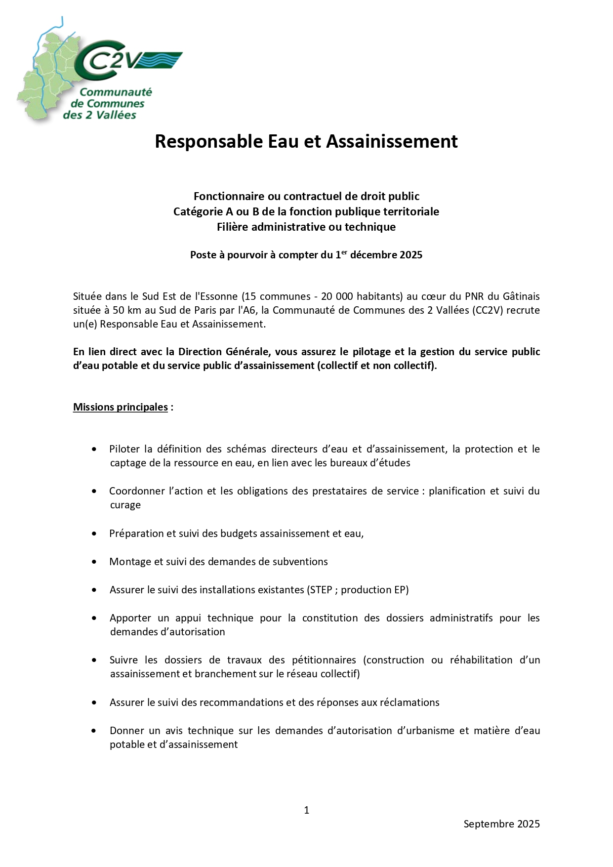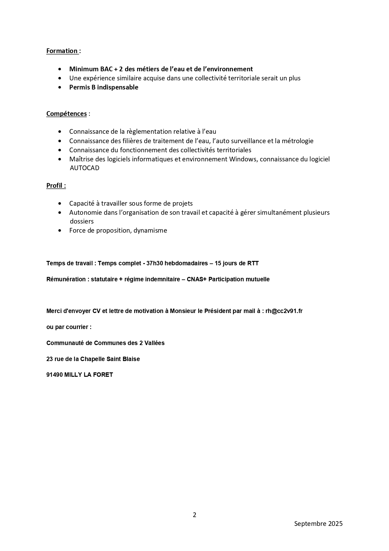 Merci d'envoyer CV et lettre de motivation à Monsieur le Président par mail à : rh@cc2v91.fr