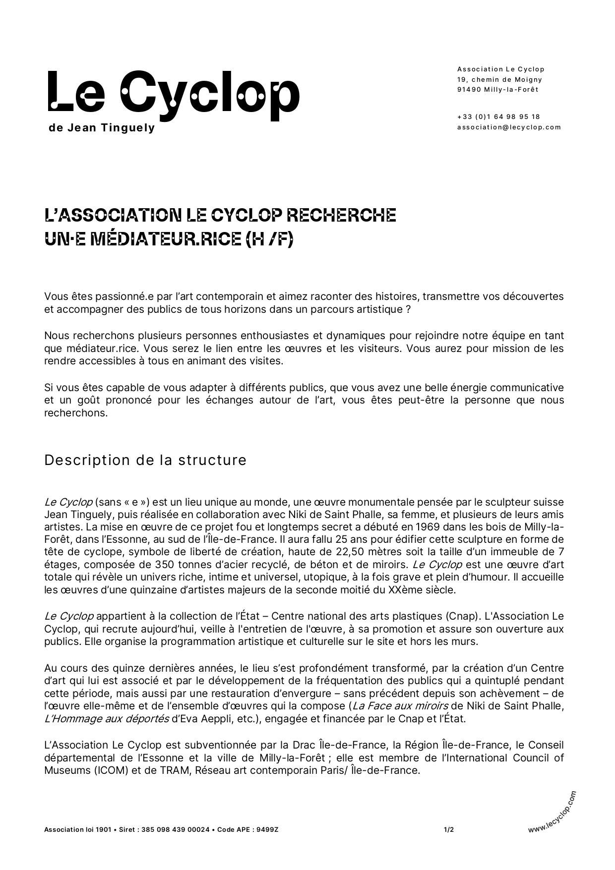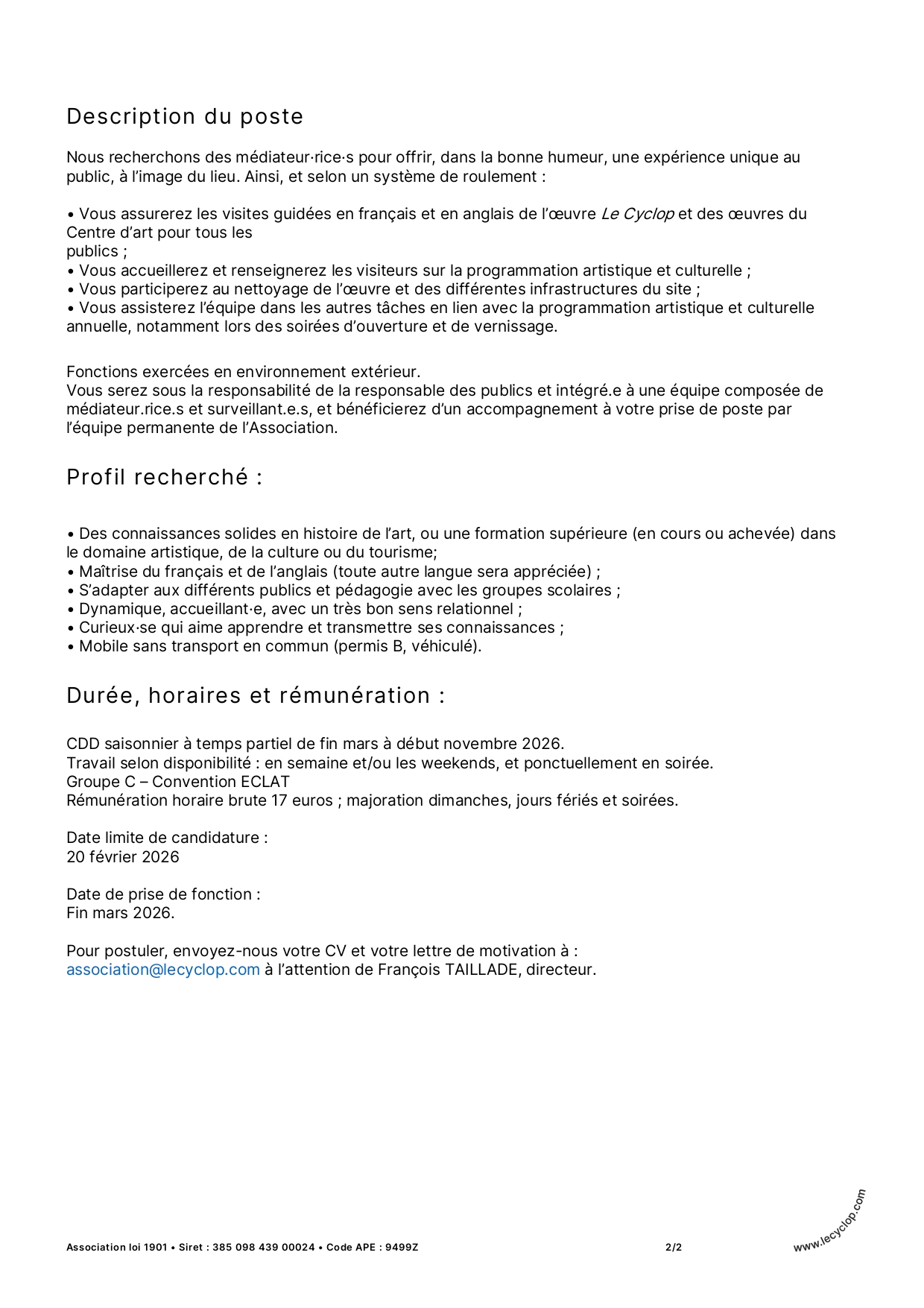 Pour postuler, envoyez-nous votre CV et votre lettre de motivation à : association@lecyclop.com à l'attention de François TAILLADE,