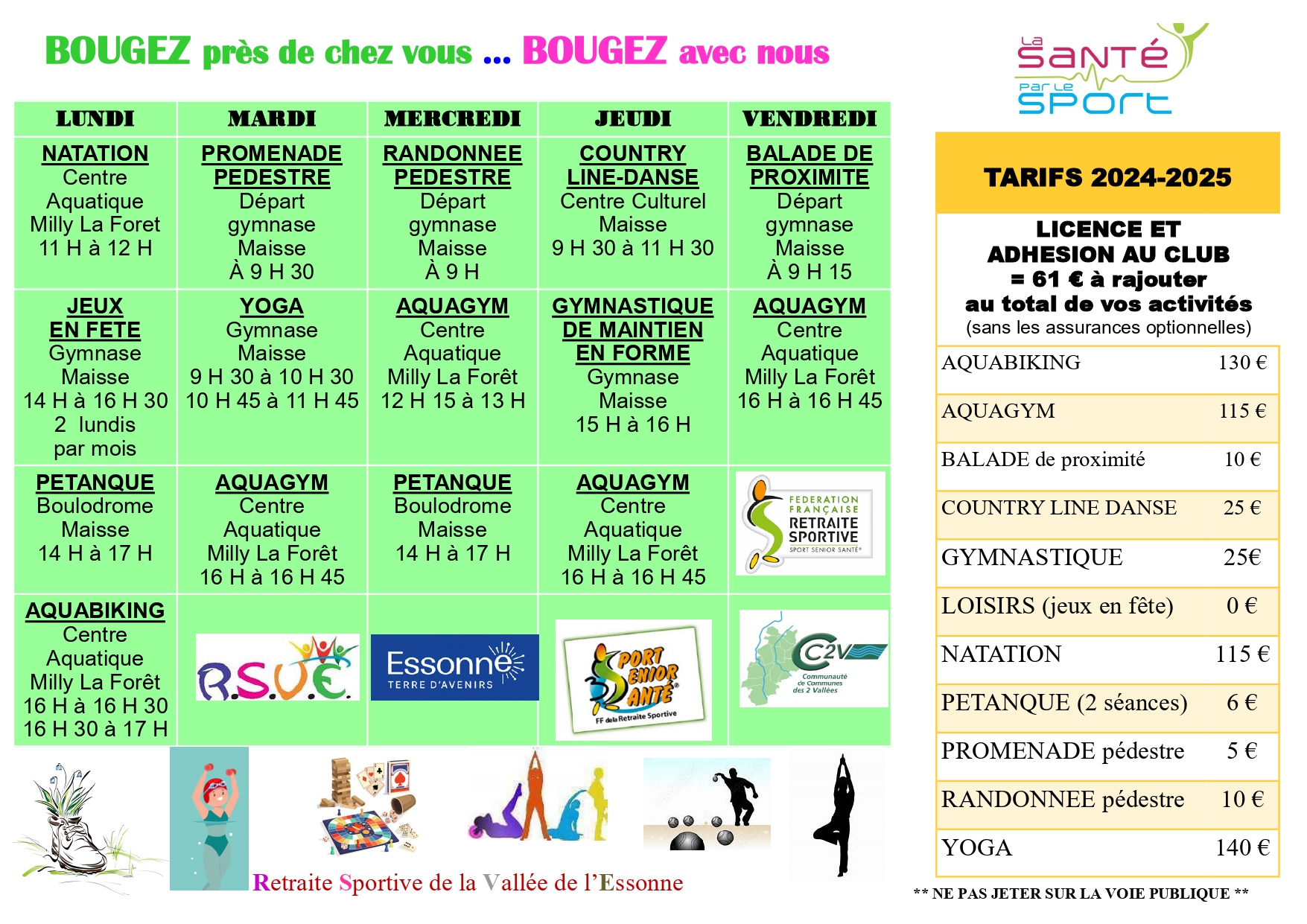 Aquabiking, aquagym, natation, promenade, balade de proximité, randonnée pédestre, country-line danse, gymnastique de maintien en forme, yoga, pétanque, activités ludiques (jeux en fête) et séjour découverte.