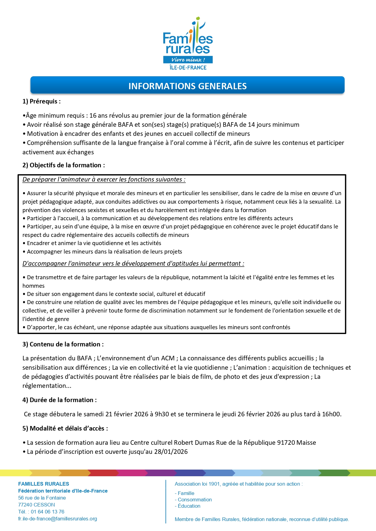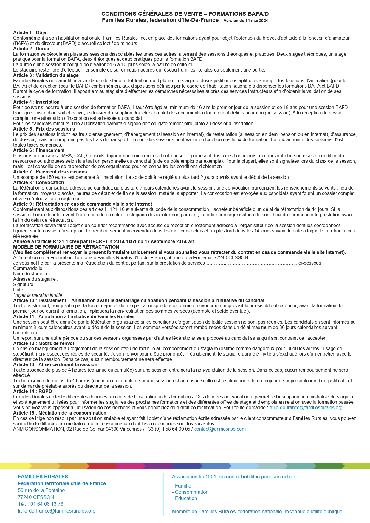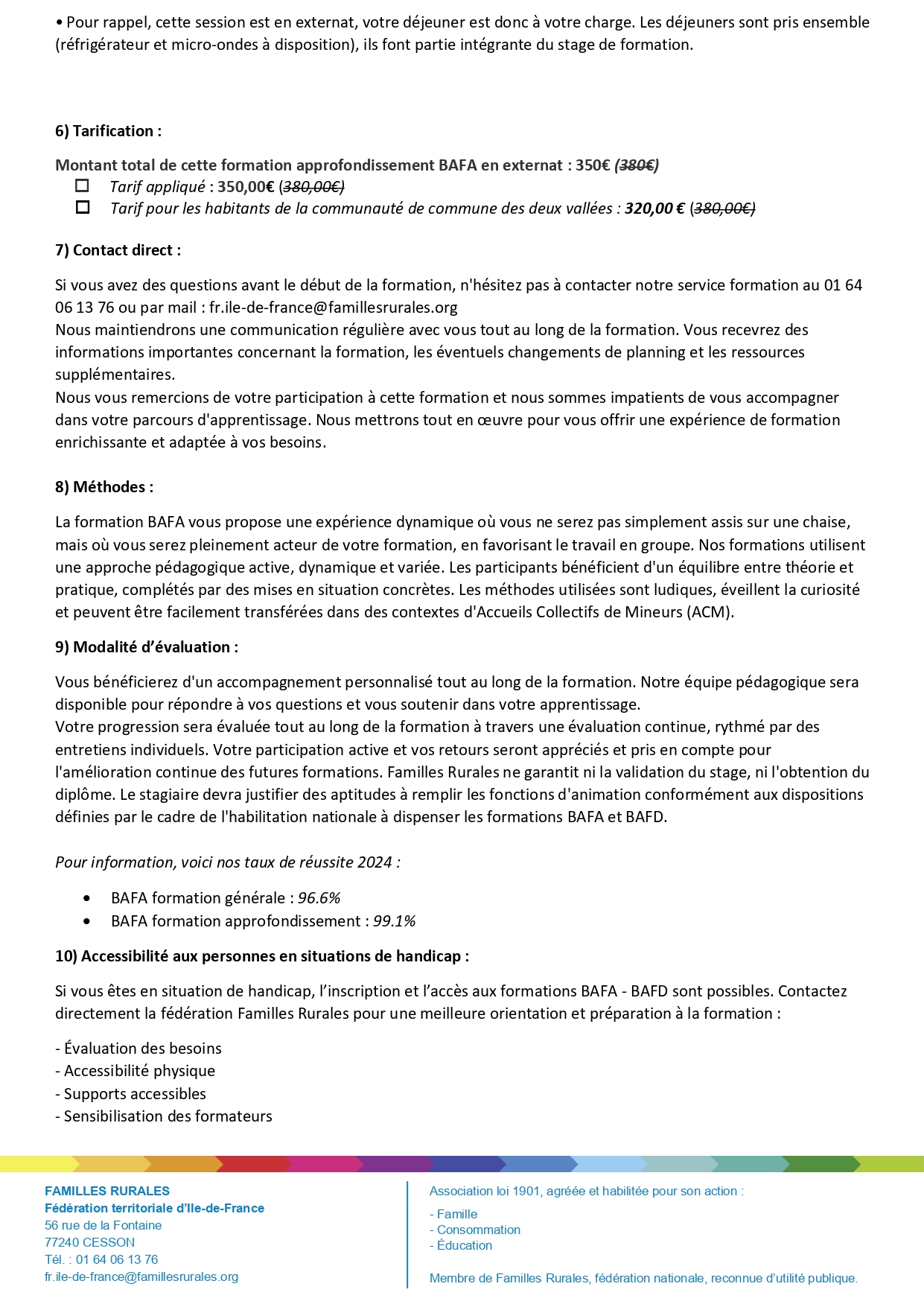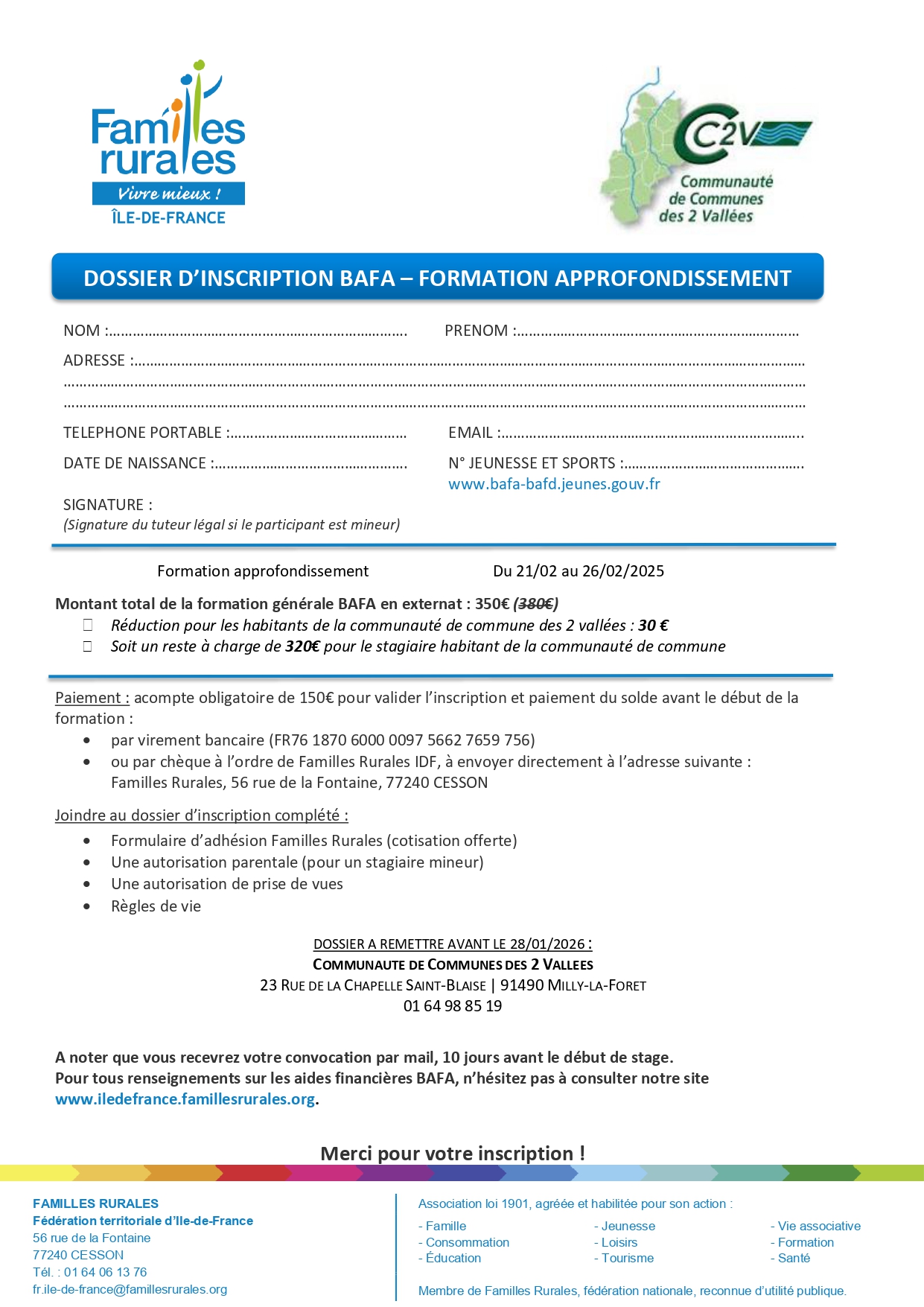 - le formulaire d’adhésion Familles Rurales (cotisation offerte),