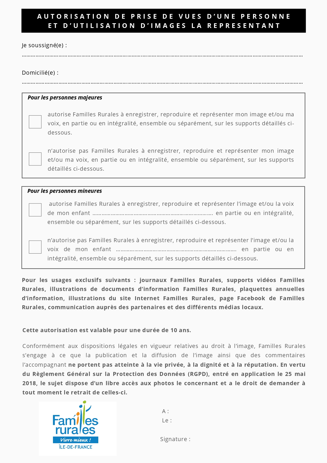 - une autorisation de prise de vues et d’utilisation de l’image,